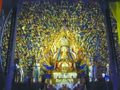大足石刻千手觀音造像高7.7米、寬12.5米,開鑿于距今800多年的南宋年間,是中國最大的集雕刻、彩繪、貼金于一體的摩崖石刻造像,也是世界文化遺產大足石刻的代表作品之一。