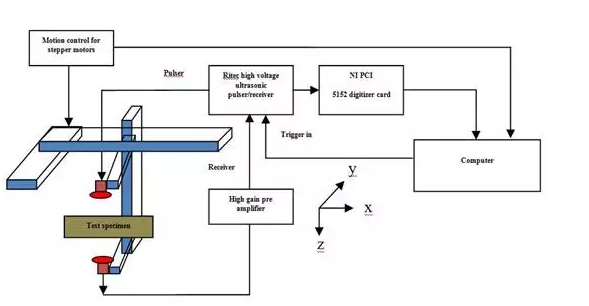 空氣耦合超聲技術(shù)是解決不宜使用聲耦合劑的特殊材料與結(jié)構(gòu)檢測問題的途徑。該技術(shù)在檢測過程中不使用耦合劑,并且適合大型結(jié)構(gòu)的快速檢測和現(xiàn)場檢測。為實(shí)現(xiàn)非接觸式超聲波檢查,必須使超聲波效的發(fā)射到空氣中,穿過檢測工件,將接收信號(hào)進(jìn)行成像處理,所以必須解決三個(gè)問題:第一,研制聲阻抗匹配層材料,實(shí)現(xiàn)探頭和空氣的最佳耦合;第二,研制超高功率發(fā)射接收器,實(shí)現(xiàn)向空中發(fā)射高功率的超聲波;第三,研制前置放大器,實(shí)現(xiàn)接收信號(hào)的增幅。