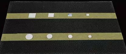 北航設(shè)計(jì)了一套空氣耦合超聲檢測系統(tǒng),并用此系統(tǒng)檢測了蜂窩夾芯復(fù)合材料,制備預(yù)埋缺陷的紙蜂窩夾芯復(fù)合材料結(jié)構(gòu)試樣如圖所示。試樣蒙皮厚度約為1mm、蜂窩芯厚度約為10mm。蜂窩夾芯復(fù)合材料試樣的空氣耦合超聲C掃描圖像,其中缺陷特征清晰可辨,驗(yàn)證了空氣耦合超聲檢測技術(shù)應(yīng)用于蜂窩夾芯復(fù)合材料脫粘檢測的可行性。