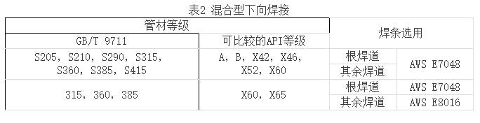 混合型下向焊接是指在長輸管道的現場組焊時,采用纖維素型焊條根焊、熱焊,低氫型焊條填充焊、蓋面焊的手工下向焊接技術。主要用于焊接鋼管材質級別較高的管道。