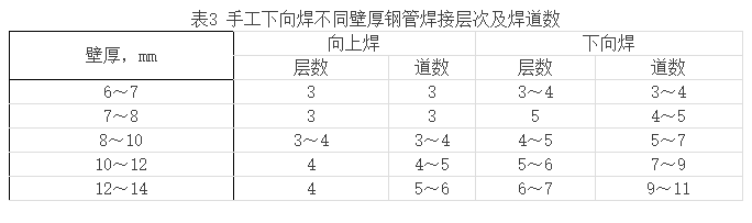 20世紀90年代末期,大壁厚管材廣泛應用國內外油、氣和水電工業長輸管道中,水電工業的壓力管道中一般管徑達1m以上,壁厚達10~60mm,在我國北方寒冷地區油氣管道壁厚也達到10~24mm。與傳統的向上焊相比,由于下向焊熱輸入低,熔深較淺,焊肉較薄,隨著鋼管壁厚的增加焊道層數也迅速增加,焊接時間和勞動強度隨之加大,單純的下向焊難以發揮其焊接速度快、效率高的特點。手工電弧焊不同壁厚鋼管焊接層次及道數推參考表見表3。而根焊、熱焊采用向下焊,填充焊與蓋面焊采用向上焊的復合下向焊技術則可發揮兩種焊接方法的優勢,達到優質高效的效果。在半自動氣體保護下向焊接技術應用于管道建設之前,大壁厚管道多采用復合型下向焊接技術。如某工業園區輸水管道工程所用鋼管規格為1400mm×14mm,材質為Q235—A。焊接過程中根焊熱焊用纖維素焊條J425G(E6010),填充焊和蓋面焊采用普通E4303焊條,使焊縫焊道層數由單一下向焊所需的7~8層,減少為4~5層,焊接時間可縮短30min,大大提高了生產效率。