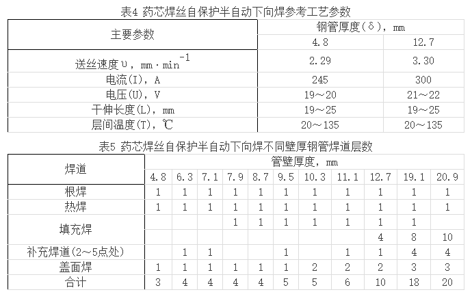 藥芯焊絲適用于各種位置的焊接,其連續性適于自動化過程生產。工藝參數見表4(以X70鋼管焊接為例)。