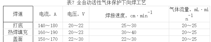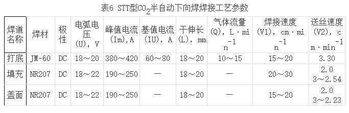 STT型CO2半自動焊以其優異的性能拓寬了CO2半自動焊在長輸管道施工中的應用領域。中國石油天然氣管道局曾在蘇丹Muglad石油開發項目中首次使用了STT型CO2半自動下向焊接技術進行管道打底焊接,中原石油勘探局建筑集團公司正在施工的陜京管線復線京—石管線工程使用了STT型CO2半自動下向焊接技術,焊接工藝見表6。