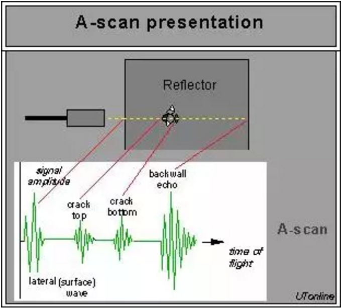 (1)A掃描來源于英文單詞Amplitude,即幅值的意思,也即顯示器的橫坐標(biāo)是超聲波在被檢測材料中的傳播時間或者傳播距離,縱坐標(biāo)是超聲波反射波的幅值。