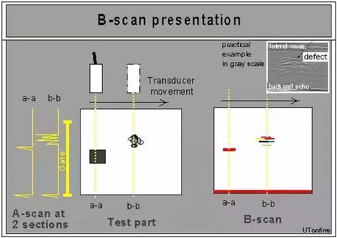 B掃描方式在掃描圖像以二維圖像顯示,屏幕顯示的是與聲速傳播方向平行且與工件的測量表面垂直的剖面。